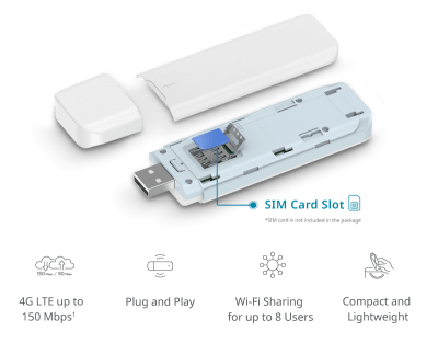 Plug and Play :Insérez simplement votre carte SIM et branchez l’adaptateur sur votre ordinateur pour vous connecter instantanément à votre Internet mobile