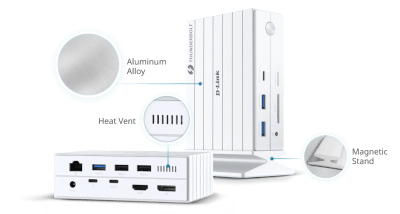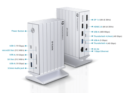 Station d'accueil Thunderbolt 4, 14-en-1 - Vidéo : 1 HDMI 2.1 (7680 x 4320 à 30 Hz) - 1 DP 1.4 (7680 x 4320 à 30 Hz) - 1 Thunderbolt 4 (connecteur multifonction) - Réseau : 1 RJ45 (10/100/1000 Base-T) - USB et Thunderbolt : Thunderbolt 4 : 40 Gbit/s avec une puissance de sortie de 15 W (5V à 3A) (connecteur multifonction) - 1 USB 3.1 Type-C (10 Gbit/s) - 2 USB 3.1 Type-A (10 Gbit/s) - 1 USB 3.0 Type-A (5 Gbit/s) - 2 USB 2.0 Type-A (480 Mbps) - Emplacements pour cartes mémoire : SD et microSD : UHS-I II ; capacité : 32 Go à 2 To - Audio : Prise audio combinée 3,5 mm : prise en charge des canaux gauche/droit et microphone - Connecteur hôte : Thunderbolt 4 (60W) : 40 Gbit/s avec USB Power Delivery (PD 3.0) pour charge rapide de 60W (USB 4)