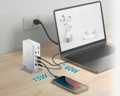 Charge rapide 60 W : Alimentez votre ordinateur portable jusqu’à PD 3.0 60 W tout en rechargeant un autre appareil à 15 W.