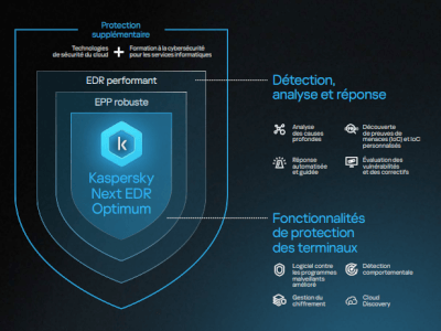 Kaspersky Next est une gamme de produits à plusieurs niveaux destinée aux entreprises de toutes tailles. Kaspersky Next Optimum est destiné aux petites et moyennes entreprises dont les équipes de cybersécurité sont réduites et qui souhaitent étendre leur protection sans complexité supplémentaire. Tout commence par une protection robuste des terminaux, renforcée par des fonctionnalités de détection et de réponse au niveau des terminaux. La solution permet un passage en douceur à la technologie essentielle XDR ou MXDR pour parvenir à un niveau sophistiqué de cybersécurité.