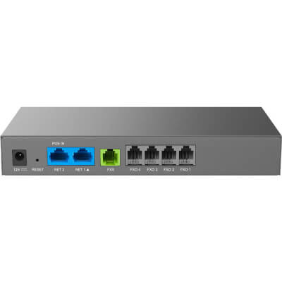 Passerelle FXO hybride avec 4 ports FXO, 1 FXS, 3 profils SIP, double port Gigabit Ethernet (PoE sur un port), fax T.38, chiffrement AES/TLS/SRTP, provisioning sécurisé via TR-069.