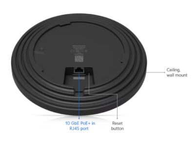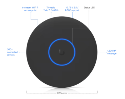 Le U7-Pro-XG est un point d’accès WiFi 7 tri-bande haut de gamme, monté au plafond, avec 6 flux et ports Ethernet 10/5/2.5/1 GbE. Il offre des performances exceptionnelles pour les environnements professionnels à haute densité, avec un design épuré et une compatibilité 6 GHz.