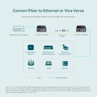 Convertisseur de média 10/100 Mbps WDM (Module A) - Conforme aux normes 802.3u 10 / 100Base-TX, 100Base-FX - Adopte la technologie WDM, transmettant et recevant des données sur une seule fibre - Prolonge la distance de fibre jusqu'à 20 km
