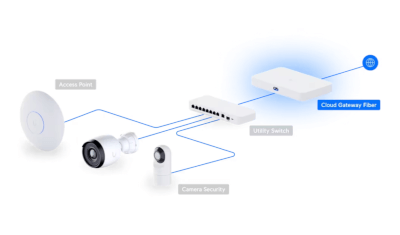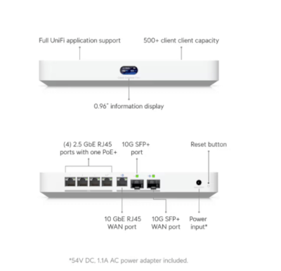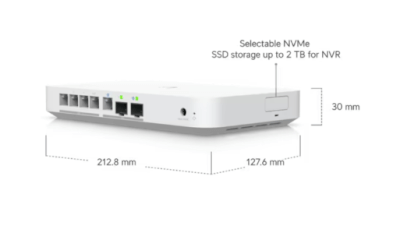 Le UCG-FIBER-EU est un Cloud Gateway 10G compact avec un switch intégré 4 ports 2.5 GbE et un stockage NVR sélectionnable.
