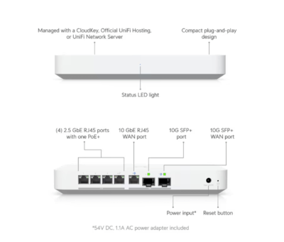 Le UXG-Fiber est un Cloud Gateway 10G compact avec un switch intégré 4 ports 2.5 GbE. Il offre une gestion centralisée via l’application UniFi, une protection IDS/IPS en temps réel, et un firewall de niveau 7