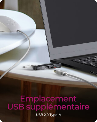 Fente USB supplémentaire - comprend une fente USB Type-A intégrée avec une vitesse de transfert allant jusqu'à 480 Mo/s, ce qui ajoute une commodité supplémentaire pour la connexion de périphériques ou d'accessoires externes. Utilisez-le pour brancher une clé USB, un clavier ou une souris tout en gérant vos cartes mémoire.