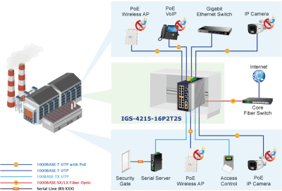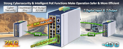 Switch RAIL DIN administrable L2+, 16 ports PoE+ (802.3at), 2 ports Gigabit et 2 SFP. Plage de température -40°C à 75°C. Alimentation non incluse (voir accessoires).