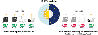 Le budget PoE du switch dépend de l'alimentation industrielle qu'on lui associe. C'est la puissance de celle-ci moins les quelques Watts consommés par le switch lui-même... (C'est évidemment aussi dans la limitation, des normes af, at ou bt multipliées par le nombre de ports PoE)